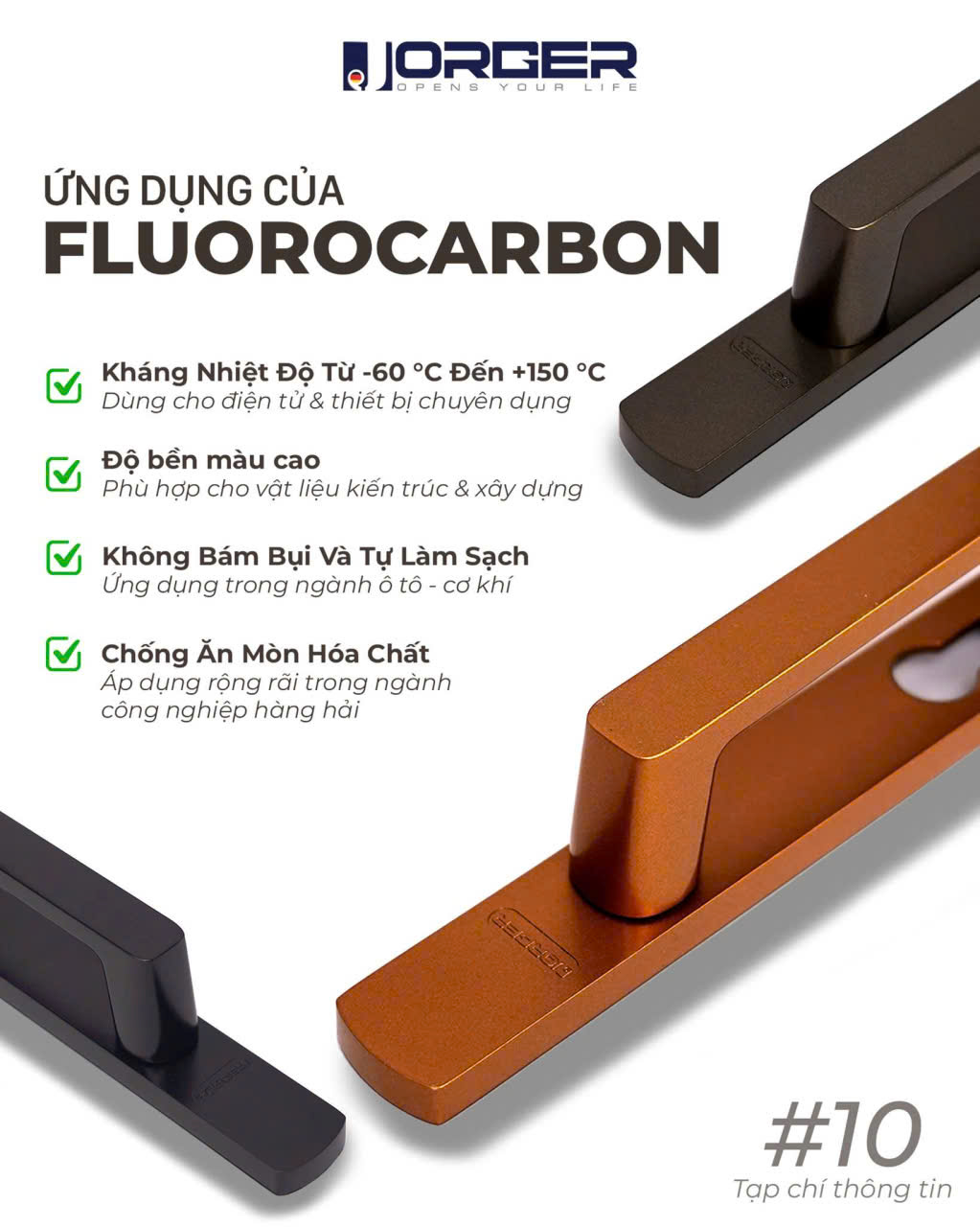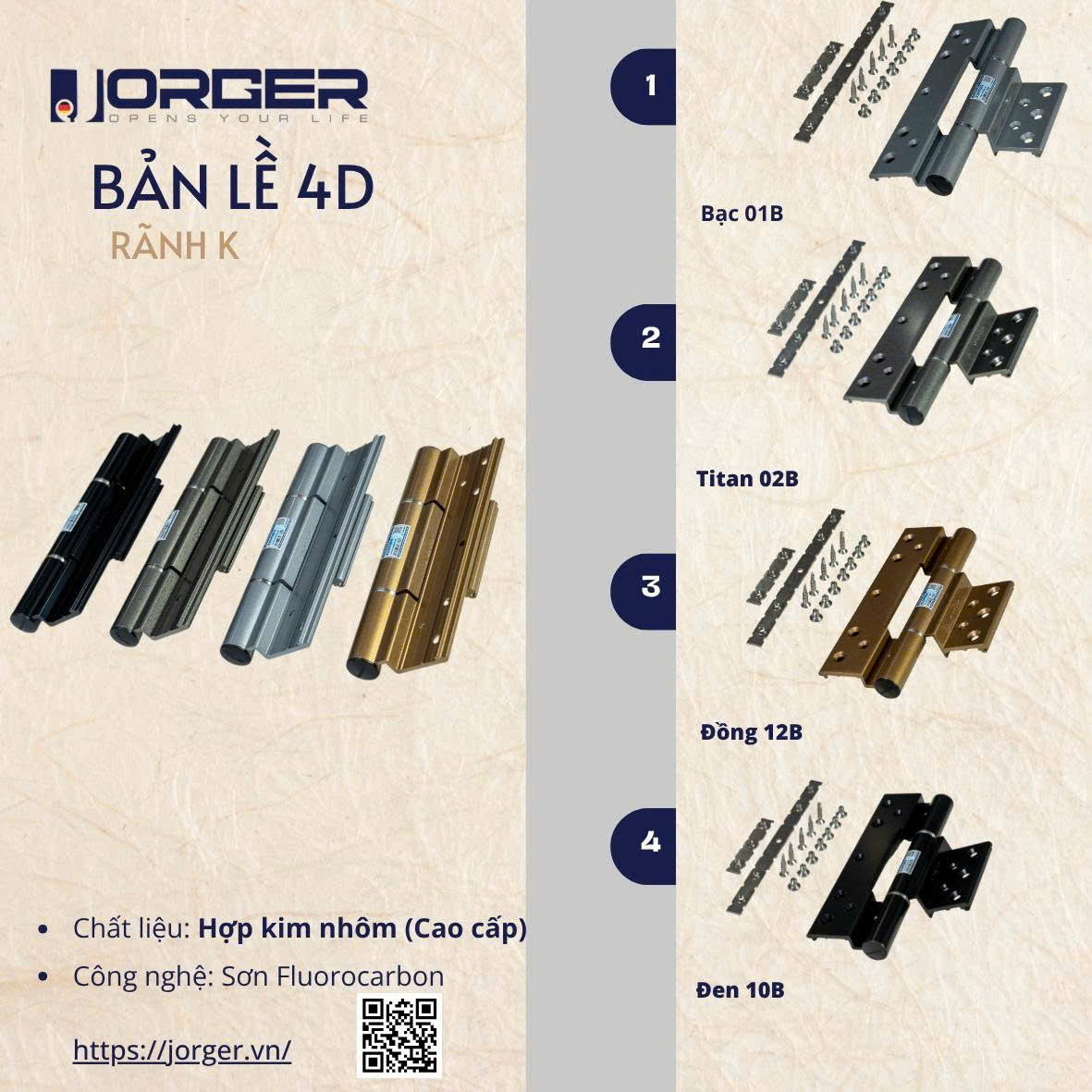 Với tầm nhìn quốc tế và tiêu chuẩn sản xuất nghiêm ngặt, JORGER khẳng định vị thế thương hiệu phụ kiện nhôm cao cấp: bền bỉ theo thời gian, sang trọng trong từng chi tiết, và là lựa chọn tin cậy cho mọi công trình hiện đại.