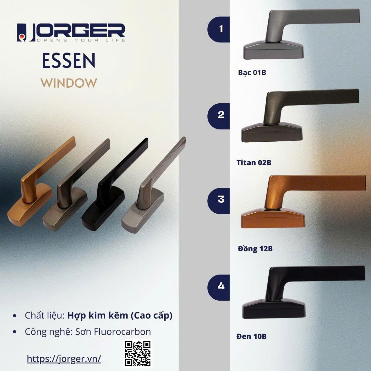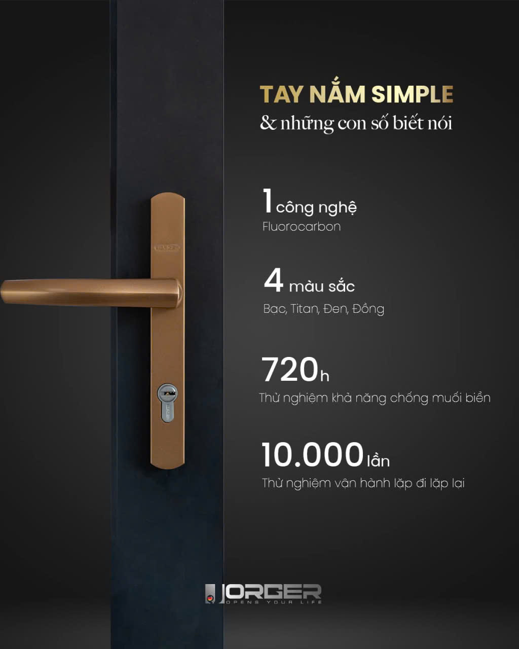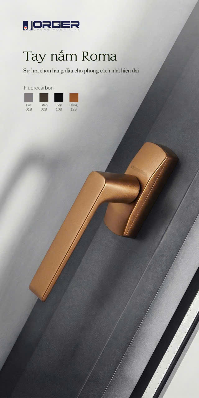 JORGER – thương hiệu phụ kiện cửa nhôm cao cấp được xây dựng từ niềm tự hào của người Việt, với sứ mệnh kiến tạo những giá trị bền vững cho công trình. Không chỉ dừng lại ở thiết kế tinh xảo và chất lượng vượt trội, JORGER chú trọng đến quá trình nghiên cứu, thử nghiệm và tối ưu sản phẩm để phù hợp với điều kiện khí hậu và thời tiết đặc thù của Việt Nam – nóng ẩm, mưa nhiều, biên độ nhiệt cao.